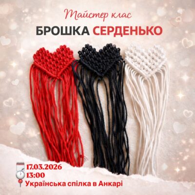 Запрошуємо на теплий творчий майстер клас, де кожен зможе власноруч створити ніжну брошку-сердечко у техніці макраме. Це чудова нагода спробувати ...Культурні мости між Україною та Туреччиною стають міцнішими