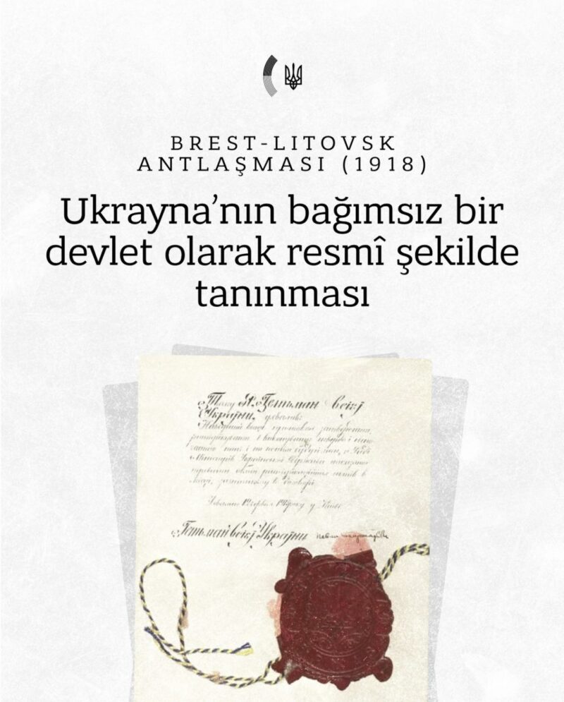 9 лютого 1918 року Українська Народна Республіка (УНР) підписала Брест-Литовський договір з Німеччиною, Австро-Угорщиною, Туреччиною та Болгарією, закріпивши міжнародне визнання України як суверенної держави.
