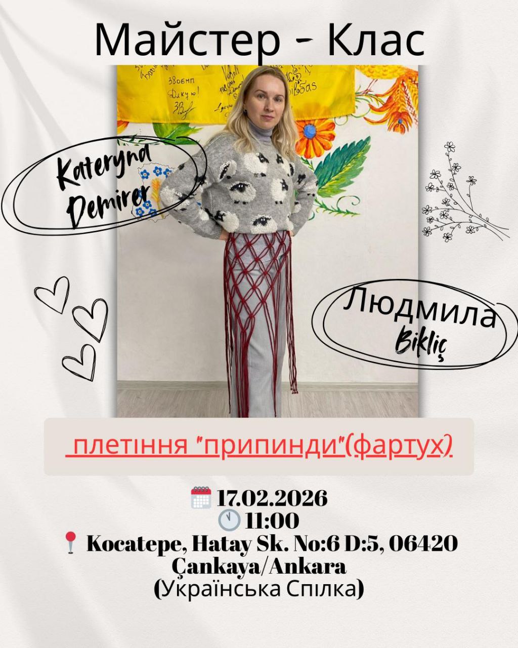 🗓️ День : 17.02.2026 (вівторок ) 🕚 Час : 11:00. 📍Місце : Kocatepe, Hatay Sk. No:6 D:5, 06420 Çankaya/Ankara (Українська спілка) @ukraynadernegi .